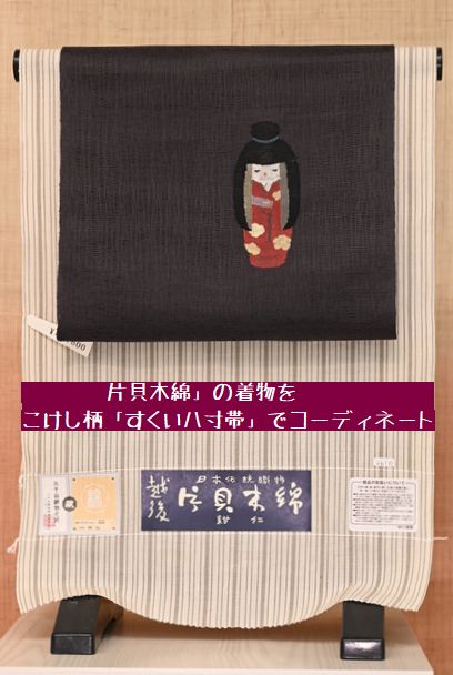 【片貝木綿の着物を少女柄すくい織りの帯でコーディネート】