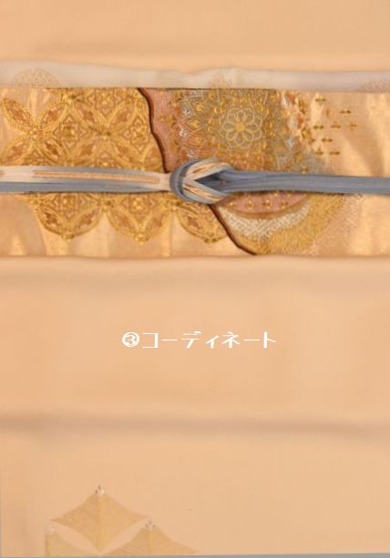お母さんがの日本刺繍されて袋帯に「力」がありまして、その力に負けない帯締を持ってこないとコーディネートが整わないことから、ころらの同系色で纏めたコーディネートとなります。