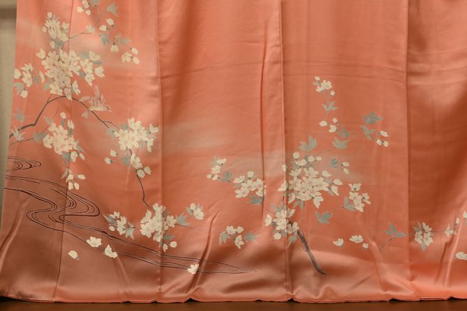 ピンクオレンジ系の地色で、ご相談を受けて、着物の地色を替えるには二つの選択肢がありまして、一つは、こちらの地色の上から別の色を引いて着物の地色をおとなしくする方法がありますが、地色を現在の色よりも淡い色に替えるこは出来ず、濃度の濃い色で染めないとなりません。