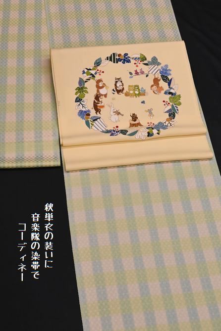 【秋単衣の装いを森の音楽隊の染帯でコーディネート】