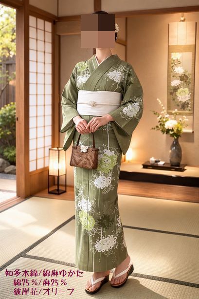 【知多木綿/綿麻ゆかた(綿75%:麻25%)「彼岸花・オリーブ」】