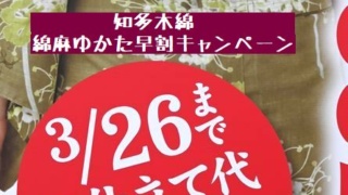 知多木綿早割キャンペーンの看板が店頭に立つ/3月26日まで綿麻ゆかたのお仕立て代を無料とします