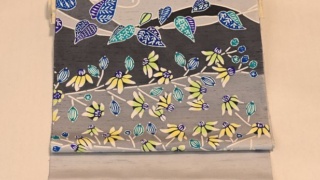 牛首紬で染めた型絵染の帯・澤田麻衣子作「ニゲラ模様」4月24日より3日間澤田氏の特集をします