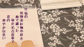 竺仙の松煙染紅梅小紋を麻織名古屋帯でコーディネート/担当者に店の主力商品であることを伝える
